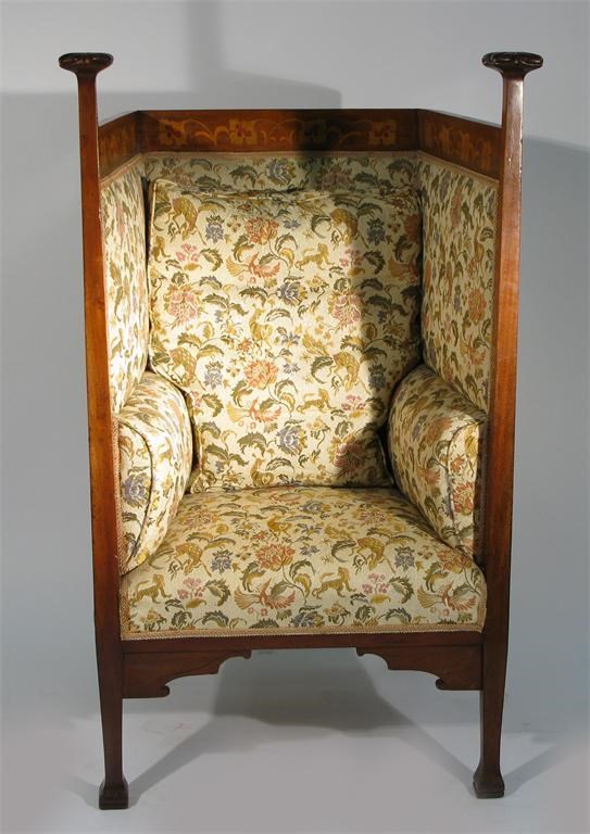 An Arts and Crafts inlaid porter's chair possibly Wylie & Lochhead, with carved flower head columns the back and sides inlaid with scrolling foliate design, embroidered seat unmarked 138cm. high