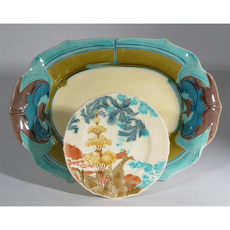 A Minton Secessionist plate designed by John Wadsworth, tubeline decorated with flowers, and a Minton Secessionist bowl impressed and painted marks, plate 13cm. diam.