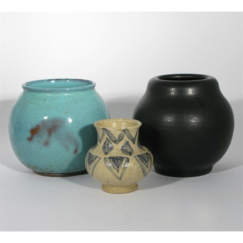 A Pilkington's Lancastrian vase by E T Radford, covered in a matt black glaze, and two studio pottery vases impressed marks 17cm. high