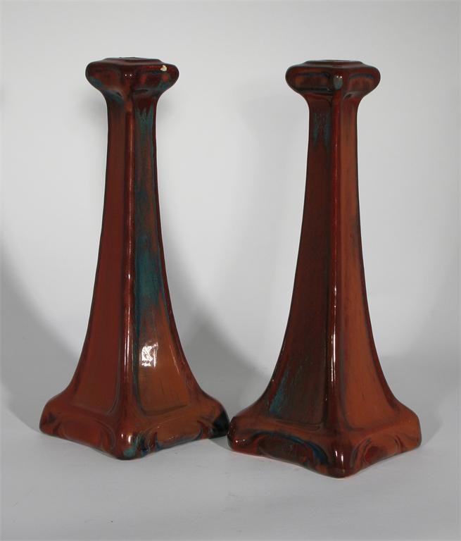 A pair of Carter's red lustre candlesticks designed by Owen Carter, architectural form, with red lustre glaze, streaked blue impressed Carter's Poole mark, minor glaze chips 32cm. high Literature Hayward & Atterbury Poole Pottery Richard Dennis Publications, page 25 for a comparable example