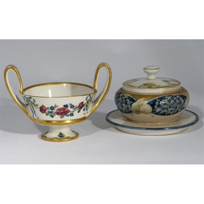 'Rose Garland' a James Macintyre twin-handled coupe designed by William Moorcroft, painted in colours and gilt on a white ground, and a 'Wisteria' pattern preserve pot and cover printed mark, facsimile signature, stained crazing and gilt wear to Wisteria piece 11cm. high