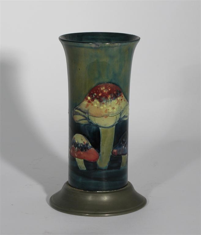 'Claremont' a Moorcroft Pottery vase with pewter foot, designed by William Moorcroft for Liberty & Co, painted in colours impressed marks, painted green signature, chip to top rim, bent pewter foot 19cm. high