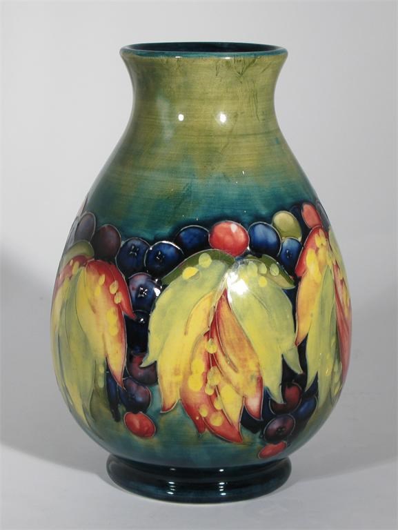 'Leaf and Berry' a Moorcroft Pottery vase designed by Walter Moorcroft, painted in colours on a graduated green to blue ground painted blue signature 24cm. high