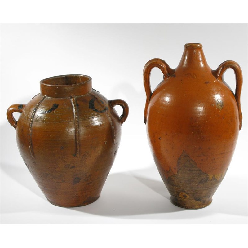 An earthenware vase with three lug handles, incised to the shoulder, glazed to the foot in mustard, and another vase with twin loop handles unsigned 14 inches (36 cm) high