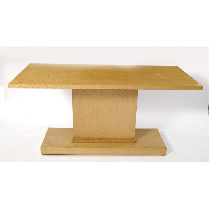 An Art Deco birds eye maple table, on central pedestal, the rectangular top inset with mother of pearl panels unsigned 62 x 27.5 inches (158 x 70 cm.)