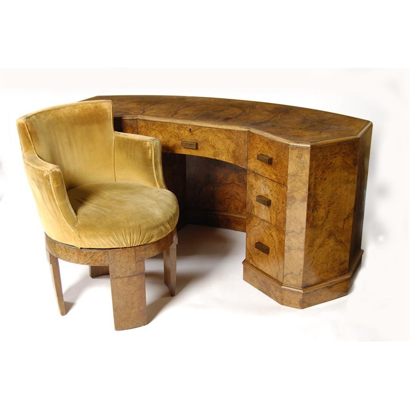 An Art Deco Waring & Gillow figured walnut veneer desk, the design attributed to Serge Chermayeff, angular form, and a matched tub chair stamped Waring & Gillow to the locks 58.75 inches (149cm) wide. (2)