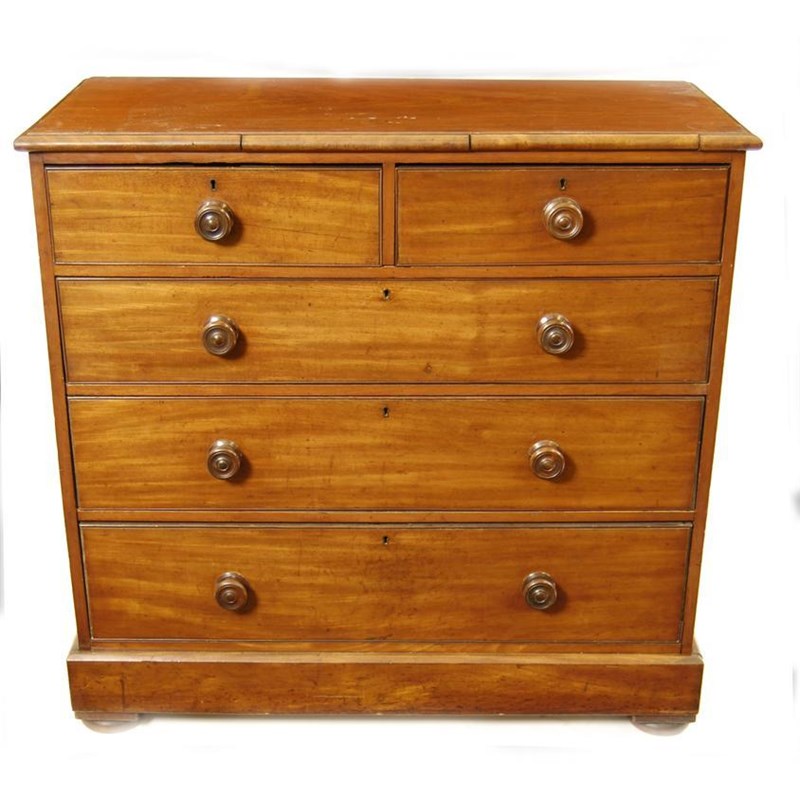 A Victorian mahogany veneer chest of drawers three long and two short, 42 inches high, 43.5 inches wide (107 x 110 cm.)