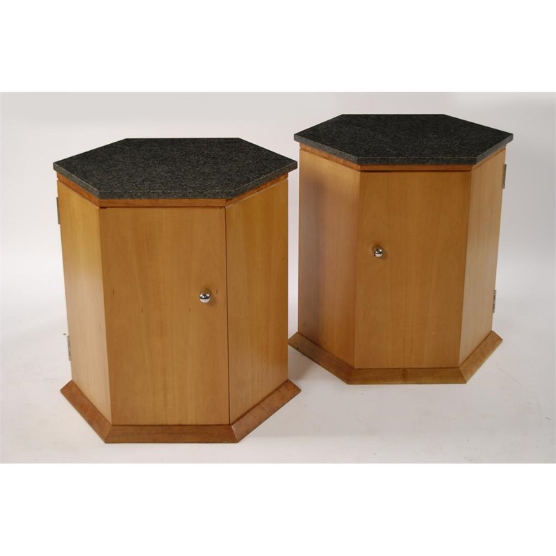 A pair of cherry wood bedside cabinets hexagonal form, with marble tops and chrome handle unsigned 26.5 inches high, 22 inches wide (67cm high, 56cm wide). (2)