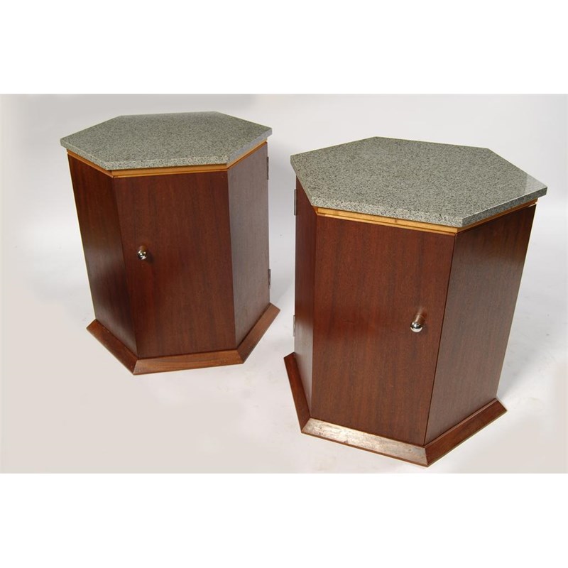 A pair of mahogany bedside cabinets, hexagonal section, with grey and black flecked marble tops, chrome furniture unsigned 26.5 inches high, 22 inches wide (67 x 56cm). (2)
