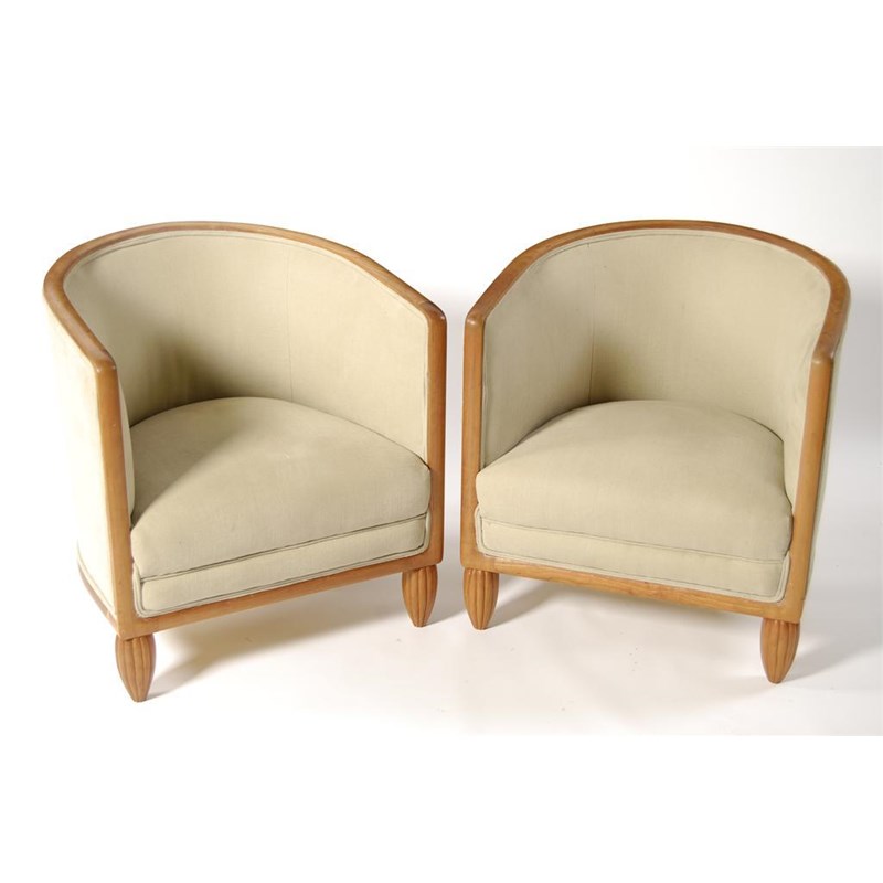A pair of Art Deco style elm tub chairs, by Matthew Burt, on ribbed bombe feet, 28.75 inches (73 cm) high. (2)
