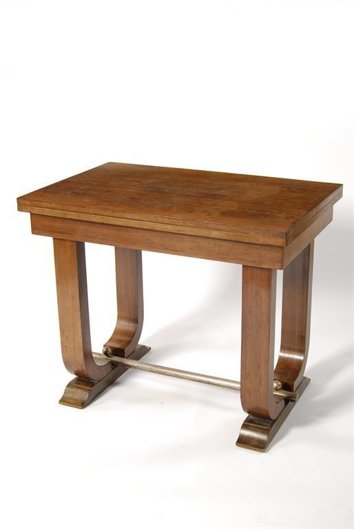 An Art Deco mahogany fold-over occasional table, with hinged top unsigned, 45.5 x 35.5 inches (116 x 90 cm.)