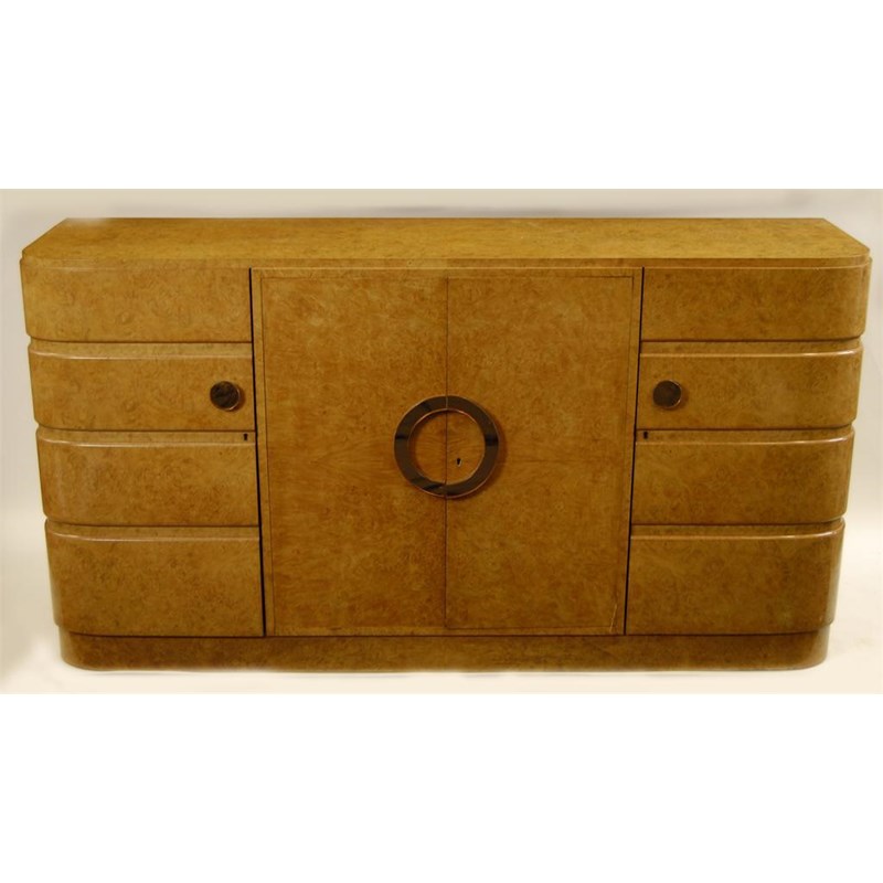 An Art Deco burr and figured walnut dining room suite, probably Hille or Epstein, comprising; twin pedestal large table, six side and two carver chairs, sideboard and serving table, with peach-tinted glass handles unsigned table 102 x 41 inches (260 x 104cm). (11)