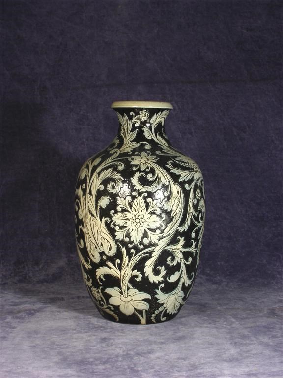 A Martin Brothers stoneware vase by Robert Wallace Martin, incised with scrolling foliage in shades of ochre on a dark brown ground incised R W Martin & Bros, London & Southall, professionally restored neck rim and base 30cm. high