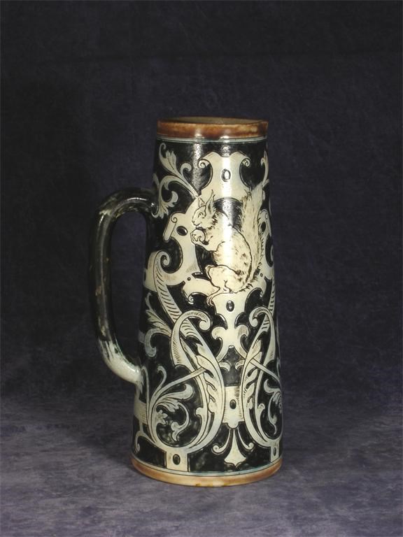 A Martin Brothers stoneware tall ewer incised with squirrels amongst Renaissance cartouche in ochre on a deep brown ground incised 4-1894 Martin Brothers London & Southall 29cm.high Malcolm Haslam The Martin Brothers Potters, Richard Dennis page 58 for a comparable jug decorated with monkies