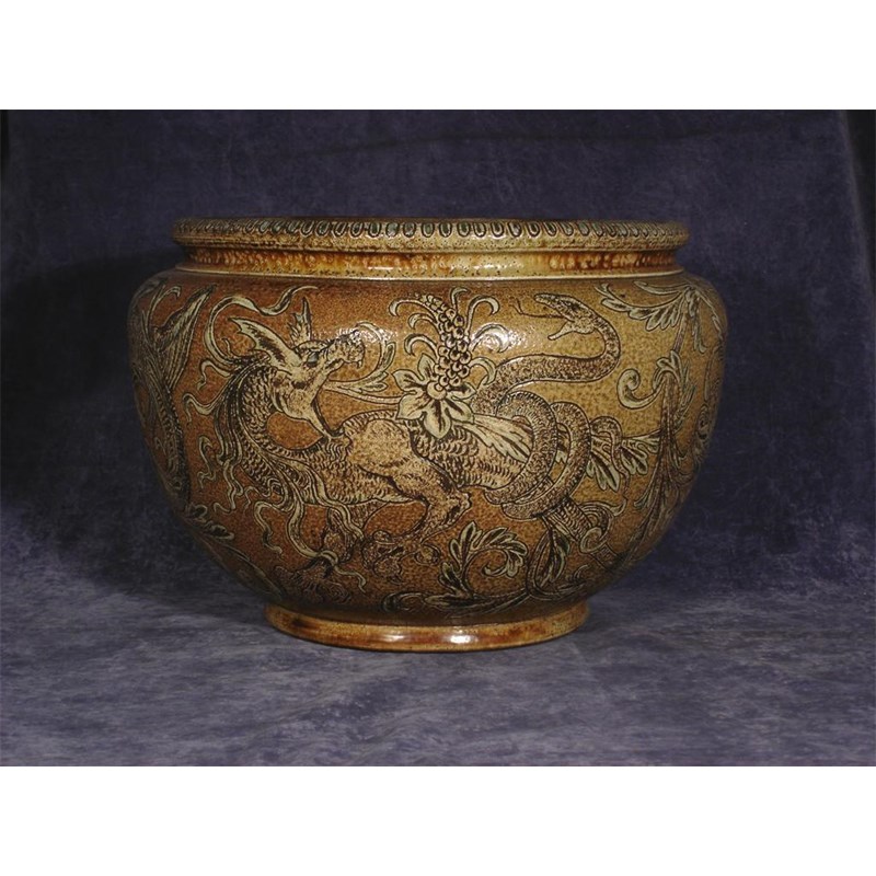 A massive Martin Brothers stoneware jardiniere incised with entwined fighting snake and dragon, amongst foliage in shades of brown and white incised 6 1888 Martin Bros, London & Southall, hairlines 30cm. high, 42cm diam.