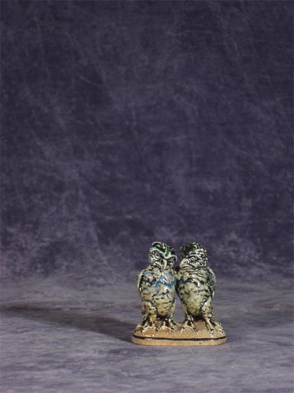 'Young Love' a rare, possibly unique stoneware miniature double bird group modelled as two chicks in shades of green and blue incised to J.C.A with E B Martin's Comps Xmas 1914, minor restoration to one wing 6.5cm. high It is possible the JCA refers to the photographer used by the Martin Brothers for publicity photographs during this period. We believe this is the only miniature double bird group in existance.