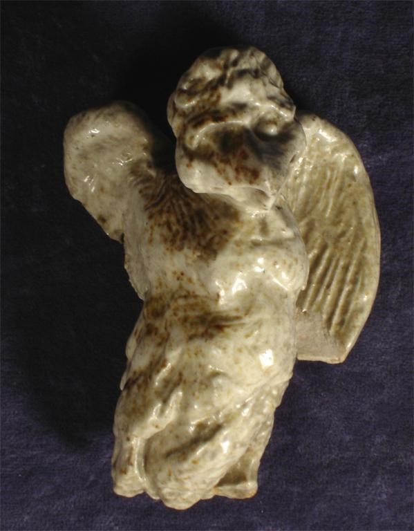 A Martin Brothers stoneware figure of a bird probably Robert Wallace Martin, glazed in shades of olive and grey unmarked, damages 9cm. high Provenance Found on the floor of the Southall pottery following bomb damage during world war II.