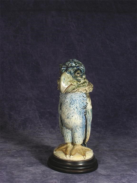 A Martin Brothers stoneware bird jar and cover modelled with webbed feet and plumage collar, in shades of blue, green and buff incised 12-1900 Martin Bros, London & Southall to the base, the head R W Martin & Bros, London & Southall 190, restored beak 23cm. high Provenance Christie's New York Important 20th Century Design 9-12th December 1994 lot 399 Christie's South Kensington Arts and Crafts 5th November 2002 lot 34