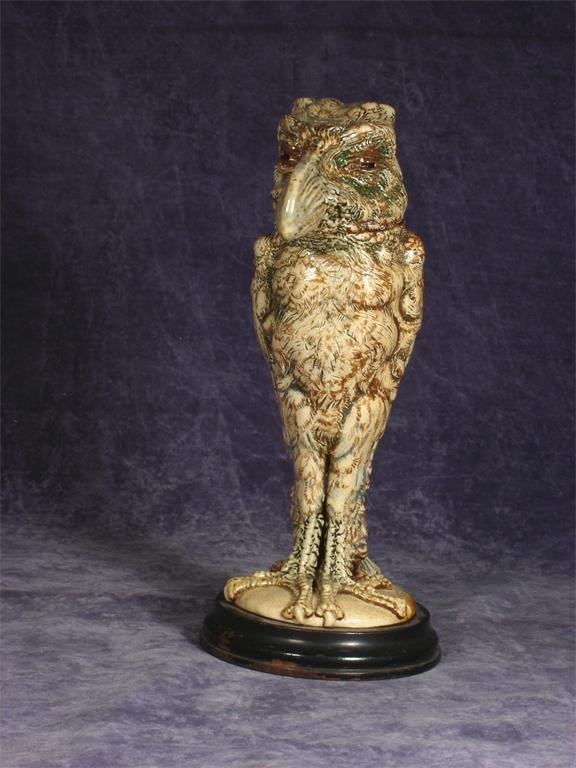 A Martin Brothers stoneware bird jar and cover by Robert Wallace Martin, tall slender stance with sly half open eyes, in shades of pale brown, blue and green on a buff ground, on ebonised wood base incised R W Martin & Bros London & Southall 27.6.1904 to head and body, repair to top rim of body 29cm. high Provenance Sotheby's London 8th July 1997 lot 173