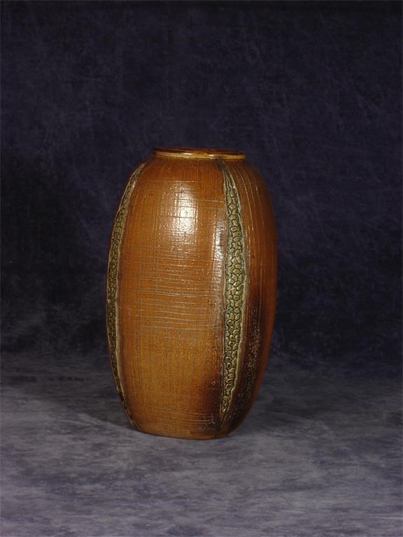 A Martin Brothers stoneware gourd vase by Walter and Edwin Martin, modelled as a bursting, ripe fruit, in shades of green and brown incised 10-1903 Martin Bros London & Southall, applied paper label, body cracks 21.5cm. high