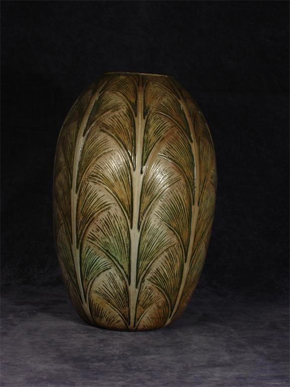 A large Martin Brothers stoneware gourd vase carved with vertical ribs and foliage palmettes in shades of green, brown and grey unmarked, restored top rim, glaze chipping. 35cm. high