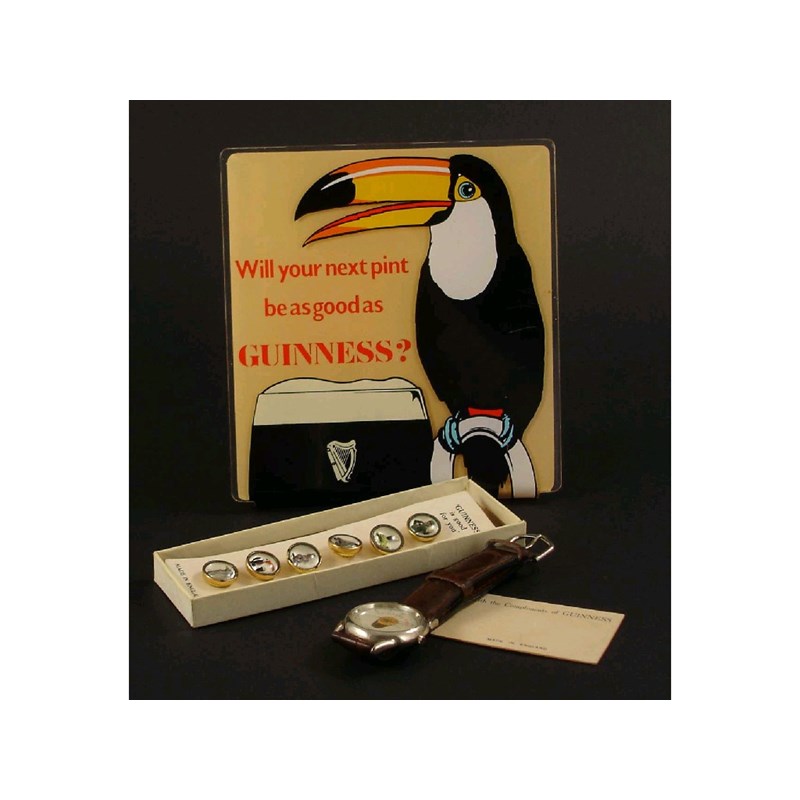 A set of Guinness advertising waistcoat buttons in original box, an advertising watch, a Toucan plastic advert and a small collection of Guinness advertising ware