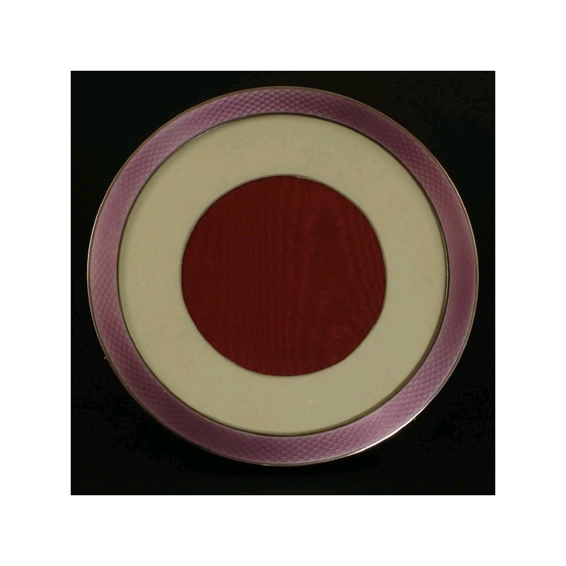 An English silver and enamel photograph frame circular form with mauve enamel, with leather easel support stamped marks, Finnigans New Bond Street London 1917 19cm. diam.