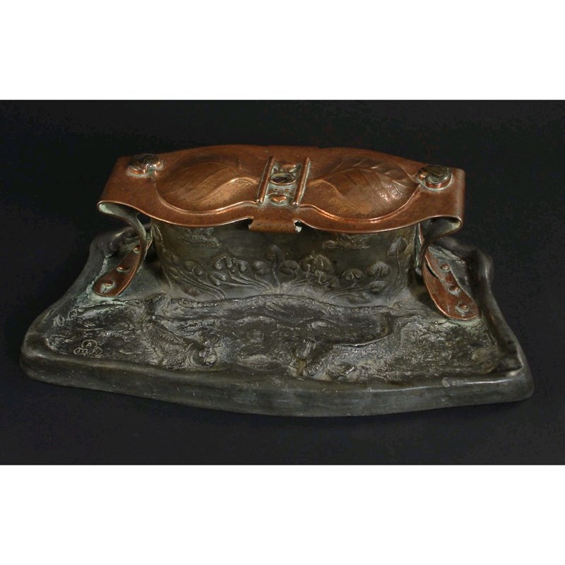 An interesting arts and crafts mixed metal double inkwell the pewter base modelled with fish, the copper strapwork with hinged leaf shaped covers, set with three abalone panels the base marked AMF 27cm. wide .