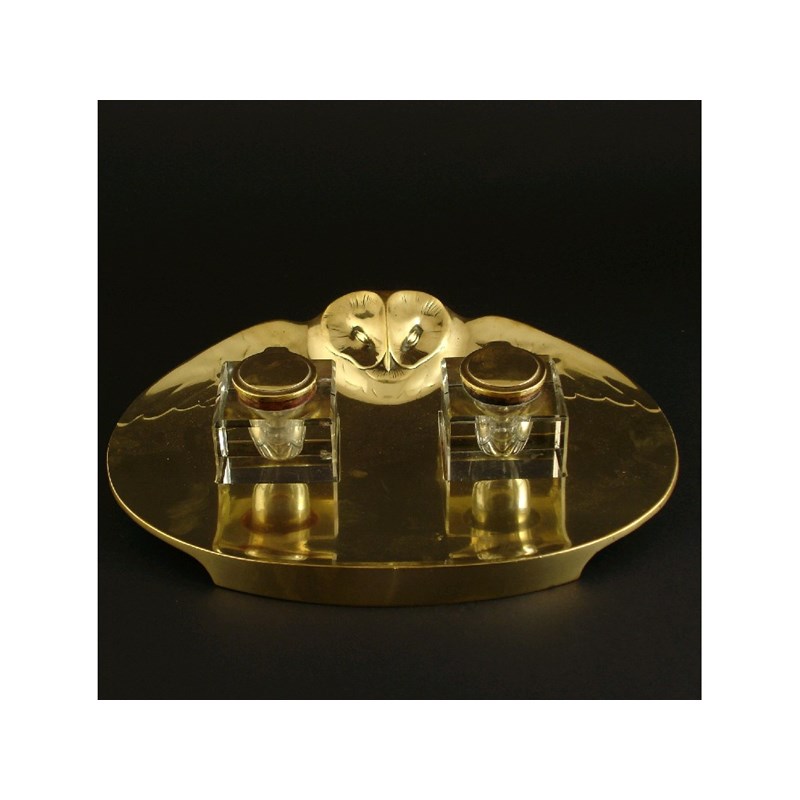 A Continental brass double inkwell cast in relief with an owl stamped marks 28cm. wide