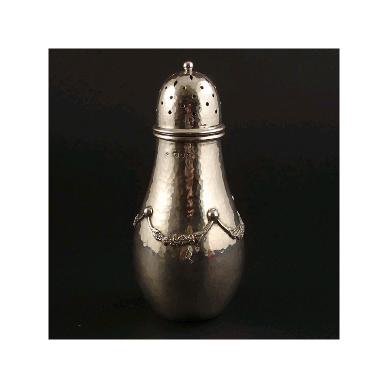 A silver sugar caster cast Garland decoration on hammered ground stamped FH, London 1938 17cm. high