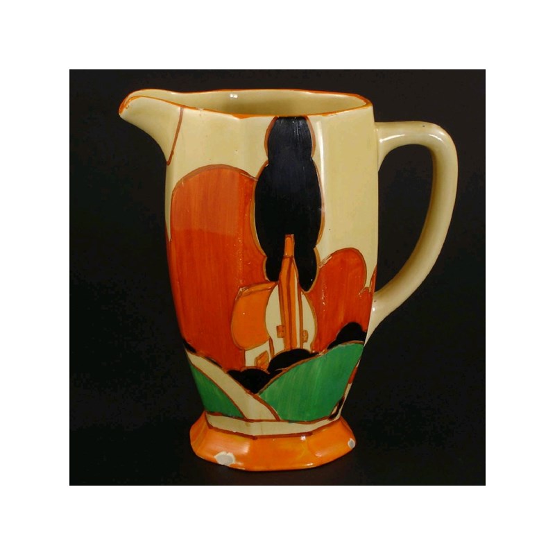 'Farmhouse' a Bizarre Athens jug printed mark, chips to base, hairline 15.5cm. high