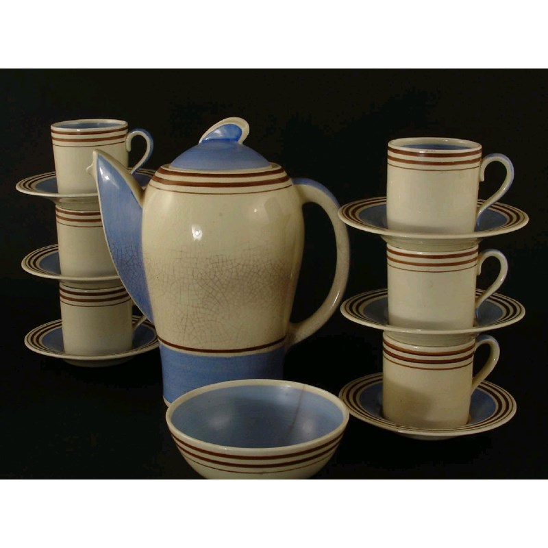 A Susie Cooper Production Kestrel coffee set for six painted with broad blue bands, comprising pot and cover, sugar, six cans and saucers printed marks, damages 20cm. high