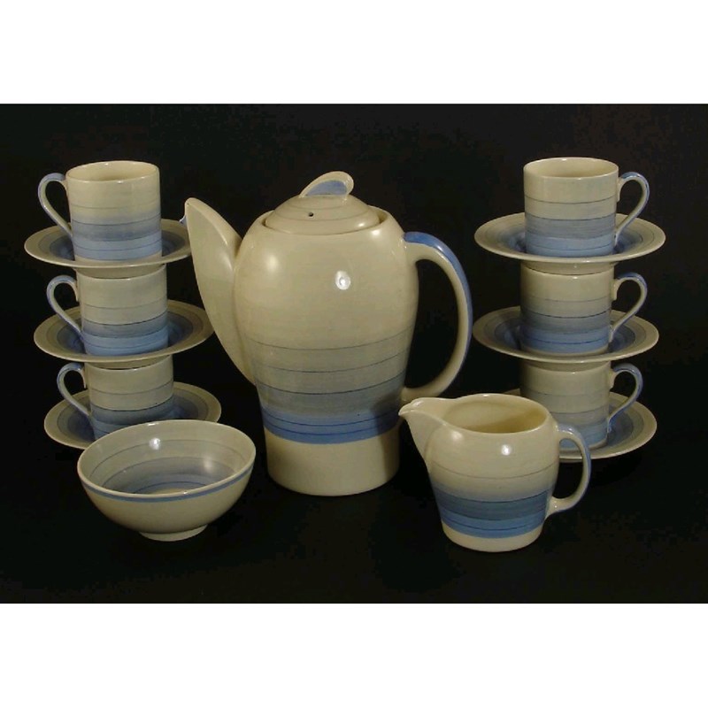 A Susie Cooper Productions Kestrel coffee set for six decorated in the Graduated Bands pattern printed marks hairline to cream jug 20cm. high