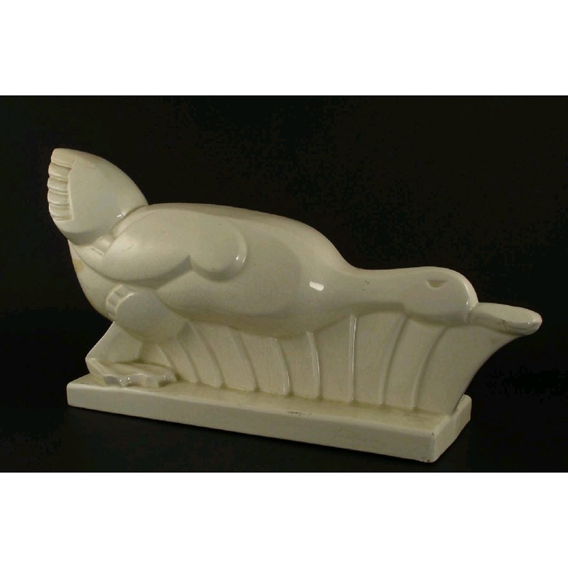A St Clement pottery duck covered in a white crackled glaze printed mark , restored tail 40cm. wide