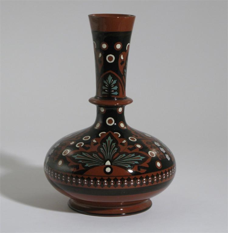 A Watcombe Pottery terracotta vase designed by Dr Christopher Dresser, compressed form, enamelled with panels of stylised foliage printed factory mark 26cm. high