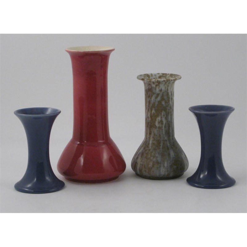 An Ault Pottery vase compressed form with cylindrical neck, covered in a pink glaze, another with a silver crystalline glaze, and four other vases impressed marks, 27cm. high