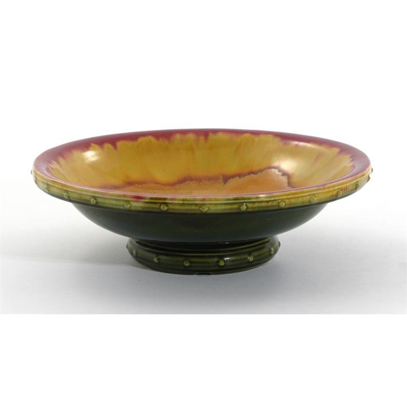 A Linthorpe Pottery bowl designed by Dr Christopher Dresser, model no.451, on modelled intregal stand, glazed olive to the exterior, the interior pink running to sand impressed marks, facsimile signature 25 cm. diam.