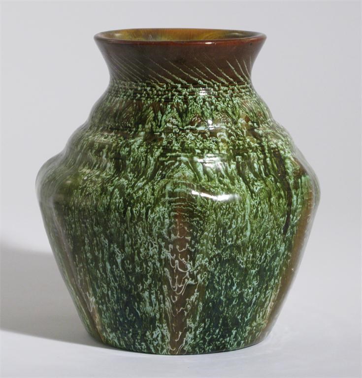 A Linthorpe Pottery vase designed by Dr Christopher Dresser, model no.159, shouldered form covered in a running green and brown glaze impressed marks, HT monogram and facsimile signature, professionally restored neck 19 cm. high
