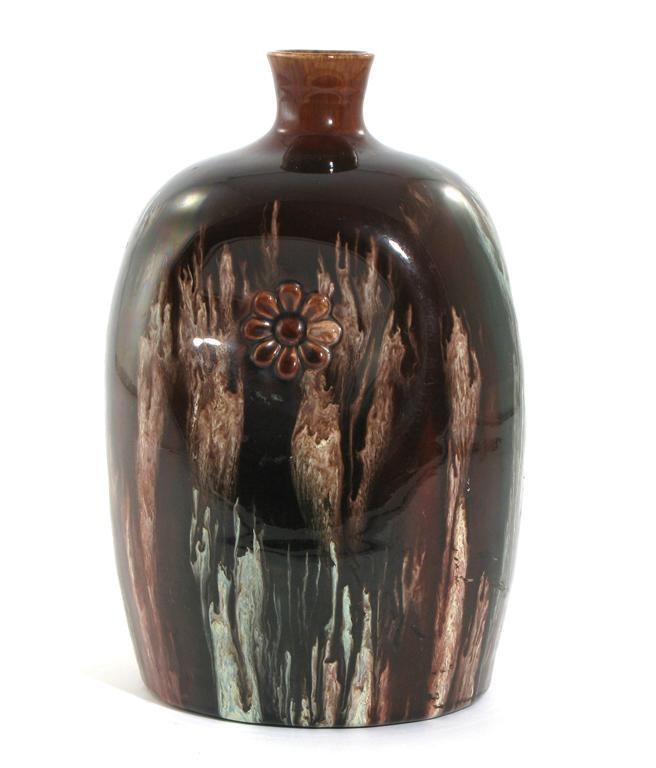A dimpled pottery vase probably Ault, designed by Dr Christopher Dresser, with applied flowerhead design, glazed running brown and blue facsimile signature to rim 21cm. high