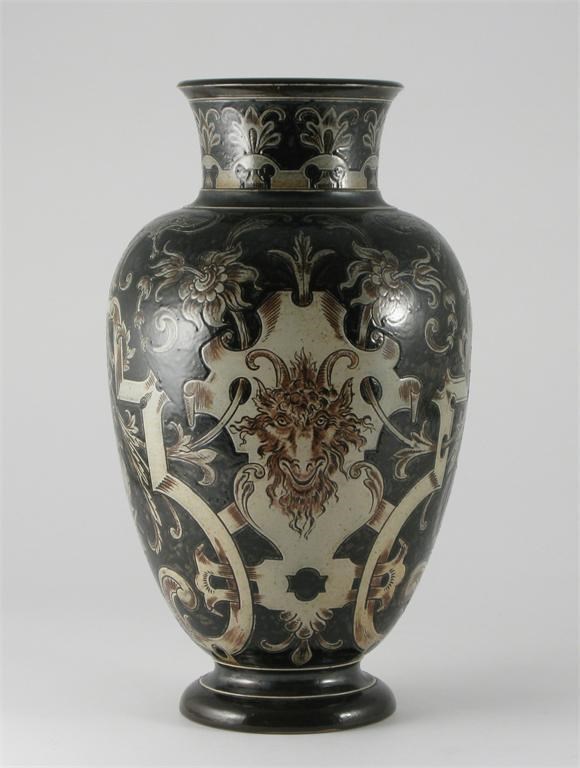 A large Martin Brothers stoneware vase baluster form, incised with panels of goat masks and crossed musical instruments, inside scrolling foliage, in shades of brown on a buff ground incised 1-1896, Martin Brothers London & Southall, 34cm. high