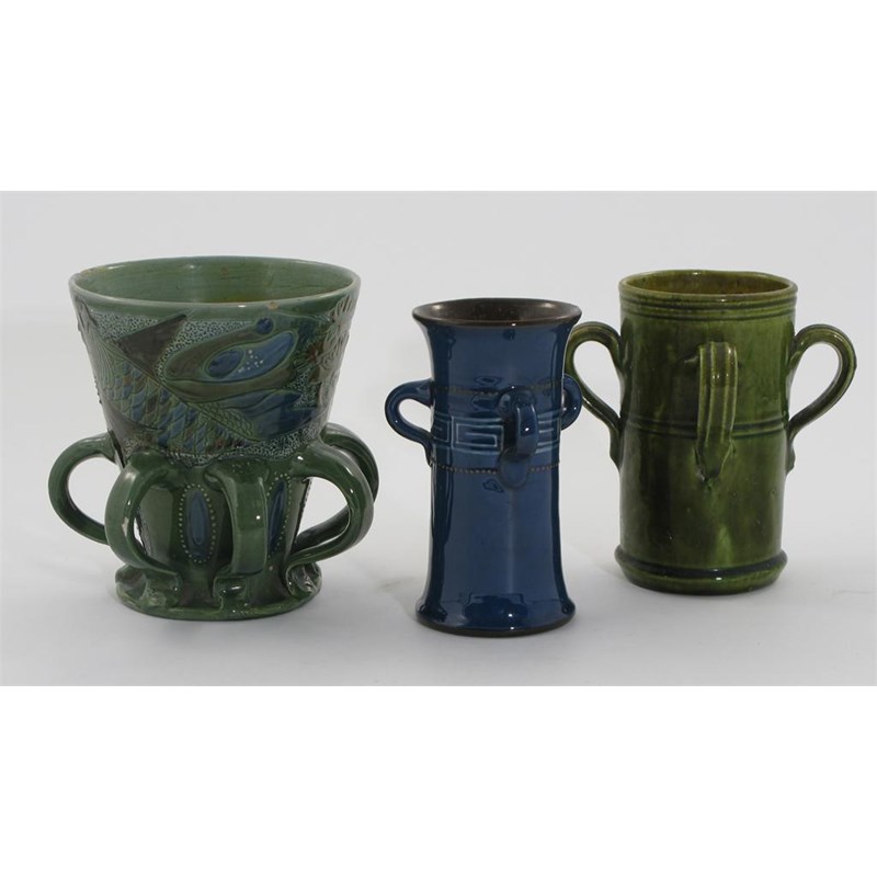 A C H Brannam, Barum vase, probably retailed at Liberty & Co, flaring conical form with seven looped handles, incised and painted with fish and two other pottery vases incised marks, FB monogram dated 1906, minor chips, 17 cm. high