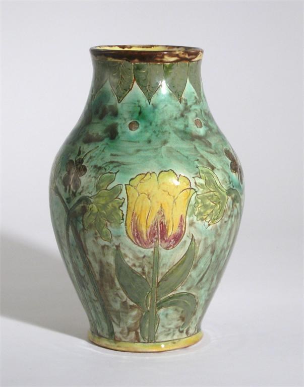A Della Robbia pottery vase by Annie Smith, incised and painted with insects flying past tulips and daffodils, in colours incised marks, AS monogram 22cm. high
