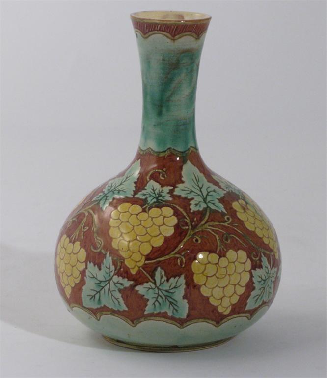 A Della Robbia pottery vase ovoid with flaring cylindrical neck, incised and painted with a fruiting vine frieze, in shades of yellow, green and ochre, incised marks, JS monogram 59 21.5cm. high