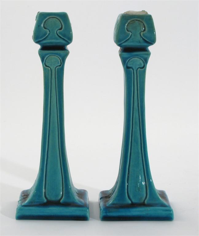 A pair of Burmantoft's Faience candlesticks, model no.2219, covered in a turquoise glaze impressed marks, 22.5cm. high