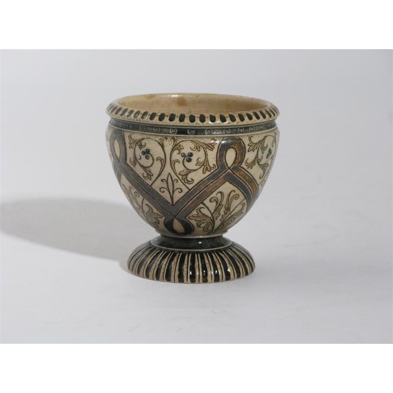 A Martin Brothers stoneware pedestal vase by Robert Wallace Martin, incised with classical foliage in shades of brown on an ochre ground incised 12 1886 R W Martin & Bros London & Southall 9cm. high