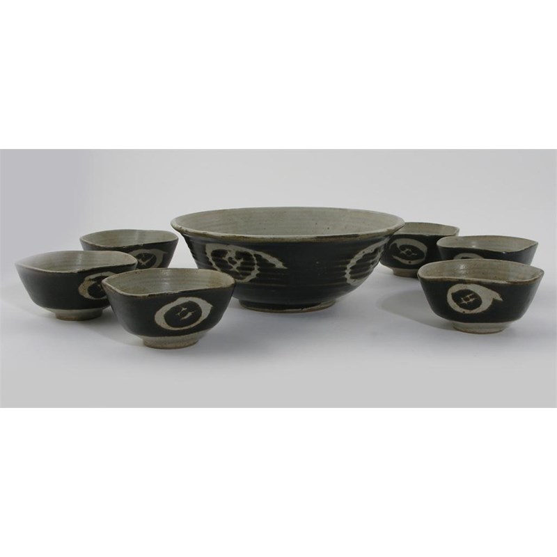a stoneware dessert set, resist decorated in tenmoku over dolomite, comprising six side bowls and a serving bowl impressed seal marks 27cm. diam.
