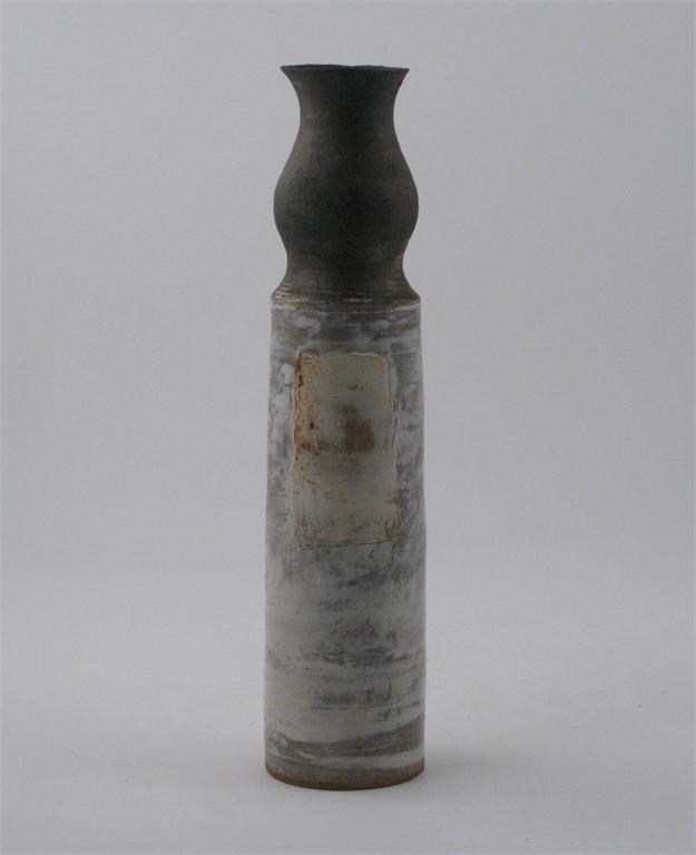 A tall stoneware vase, shouldered form with everted rim, glazed and painted in black, cream and ochre with rectangular panels, the rim with lustre finish impressed RW seal mark 44.5 cm. high