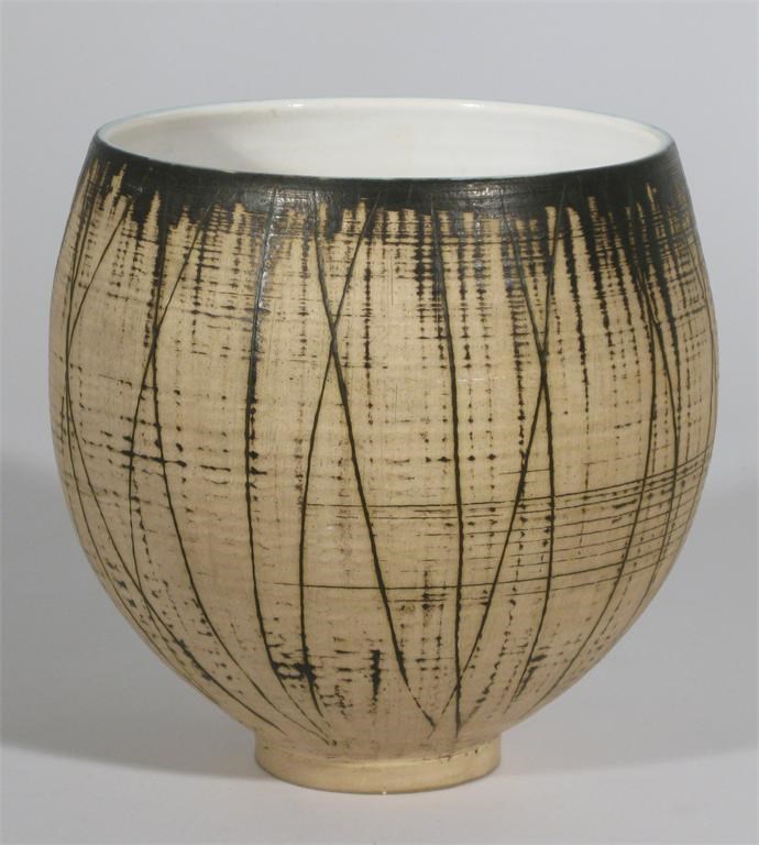 a pedestal bowl, with incised decoration glazed bronze on a cream ground, the interior glazed cream impressed mark 17cm. high