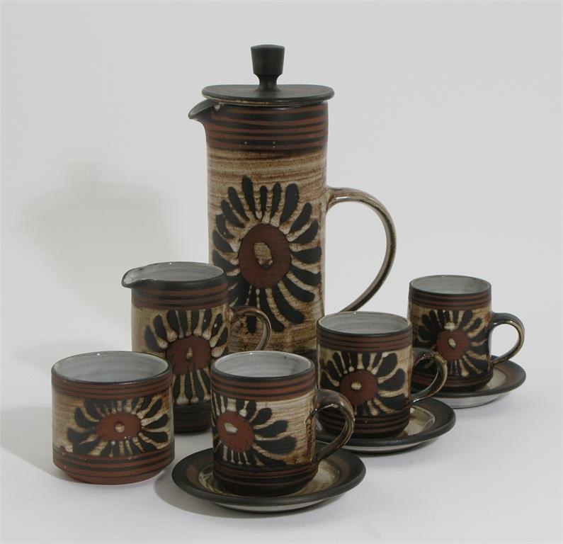 a terracotta coffee set, painted with a splash flowerhead design, comprising; coffee pot and cover, milk and sugar basin, six cans and saucers impressed Briglin 22cm. high