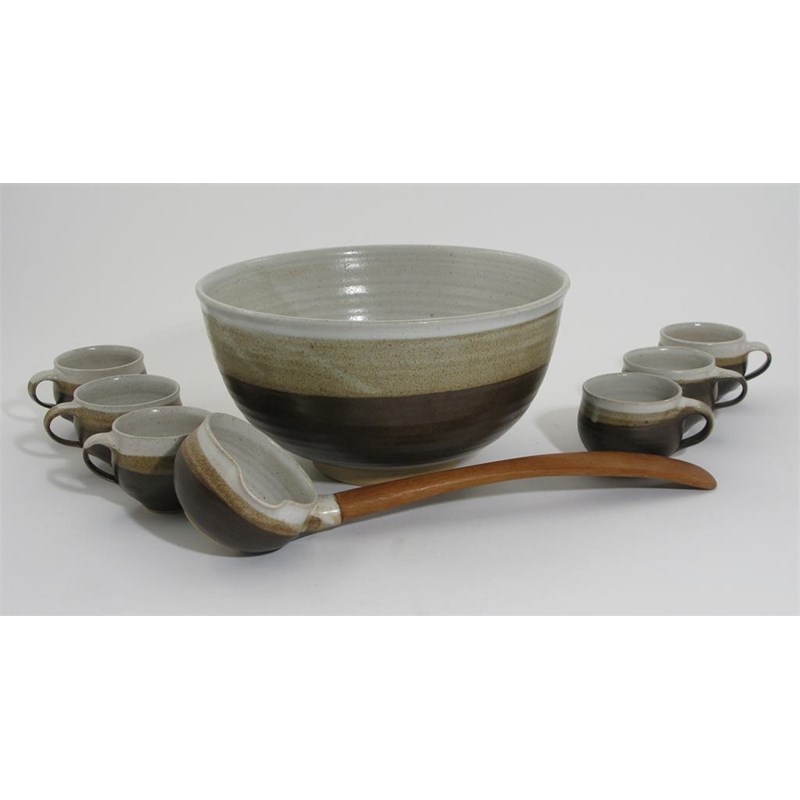 an earthenware punch bowl and cup set, bronze, buff and oatmeal bands, comprising; large serving bowl, wooden handled ladle and six cups impressed seal mark bowl 27cm. diam.